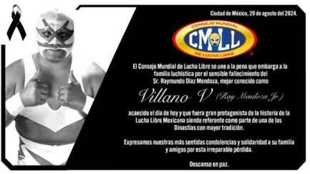 NEWS Raymundo Mendoza Jr. (Villano V) passes away August 29, 2024 Andrew Thompson CMLL posts a graphic to announce the passing of Villano V.